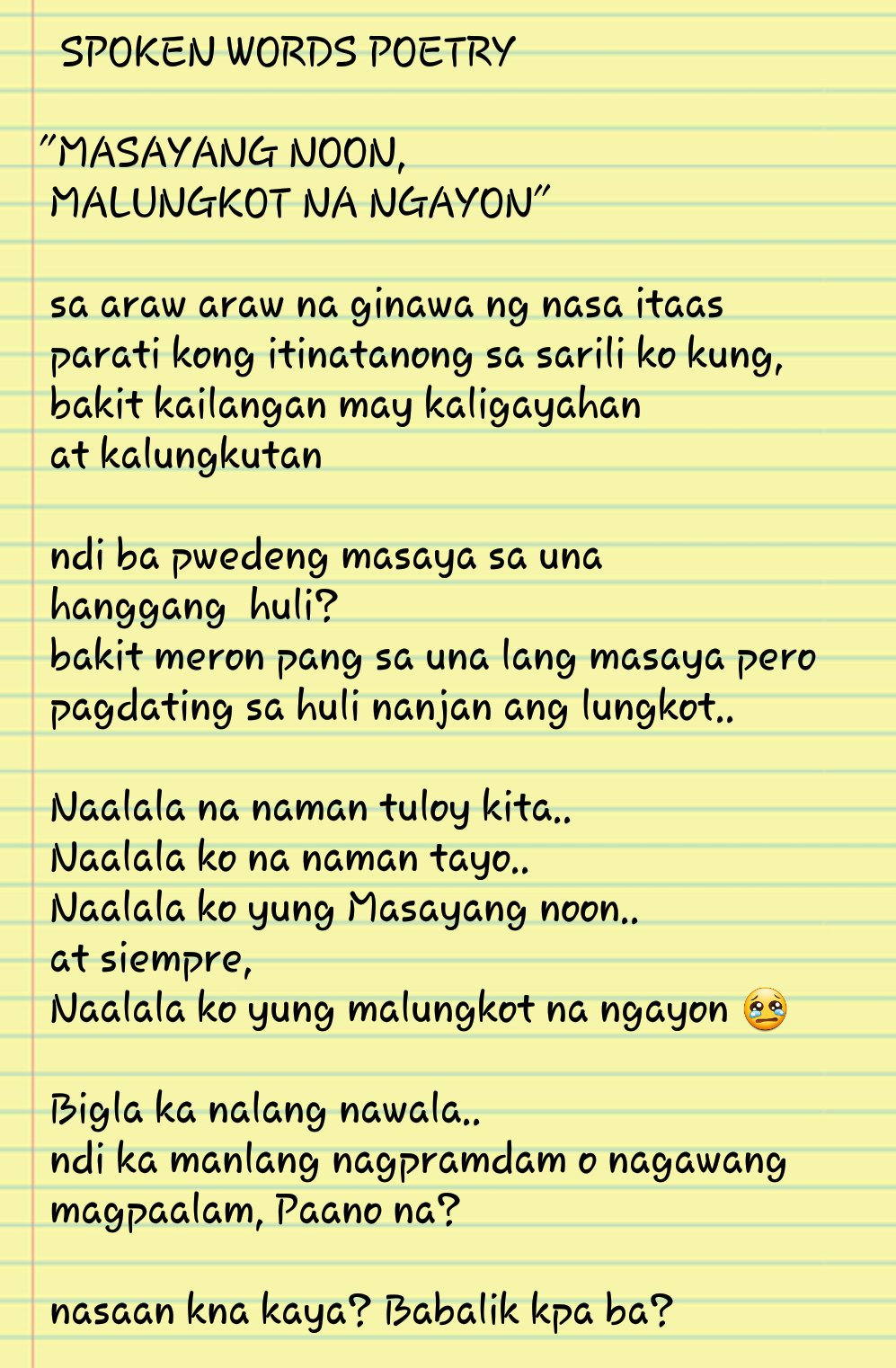 Sana po ay maka-tuloy ito sa mga taong Broken Hearted sa mga taong hindi maka-move on. Here are 13 of our favorite Tagalog spoken poetry performances that will either leave you feeling elated or heartbroken. Dahil pagmamahalan parin ang nangibabaw Darling you look perfect tonight Masaya ng makilala ka.